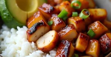 Juicy chicken coated in a sweet and spicy hot honey glaze, served over fluffy rice with fresh, colorful vegetables for a vibrant and satisfying meal.