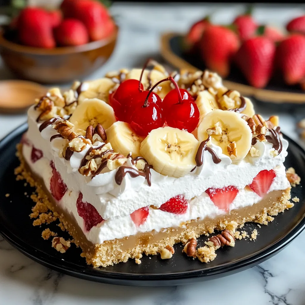 A delightful no-bake cheesecake inspired by the classic banana split, featuring a graham cracker crust, creamy filling, fresh fruit, and whipped topping.