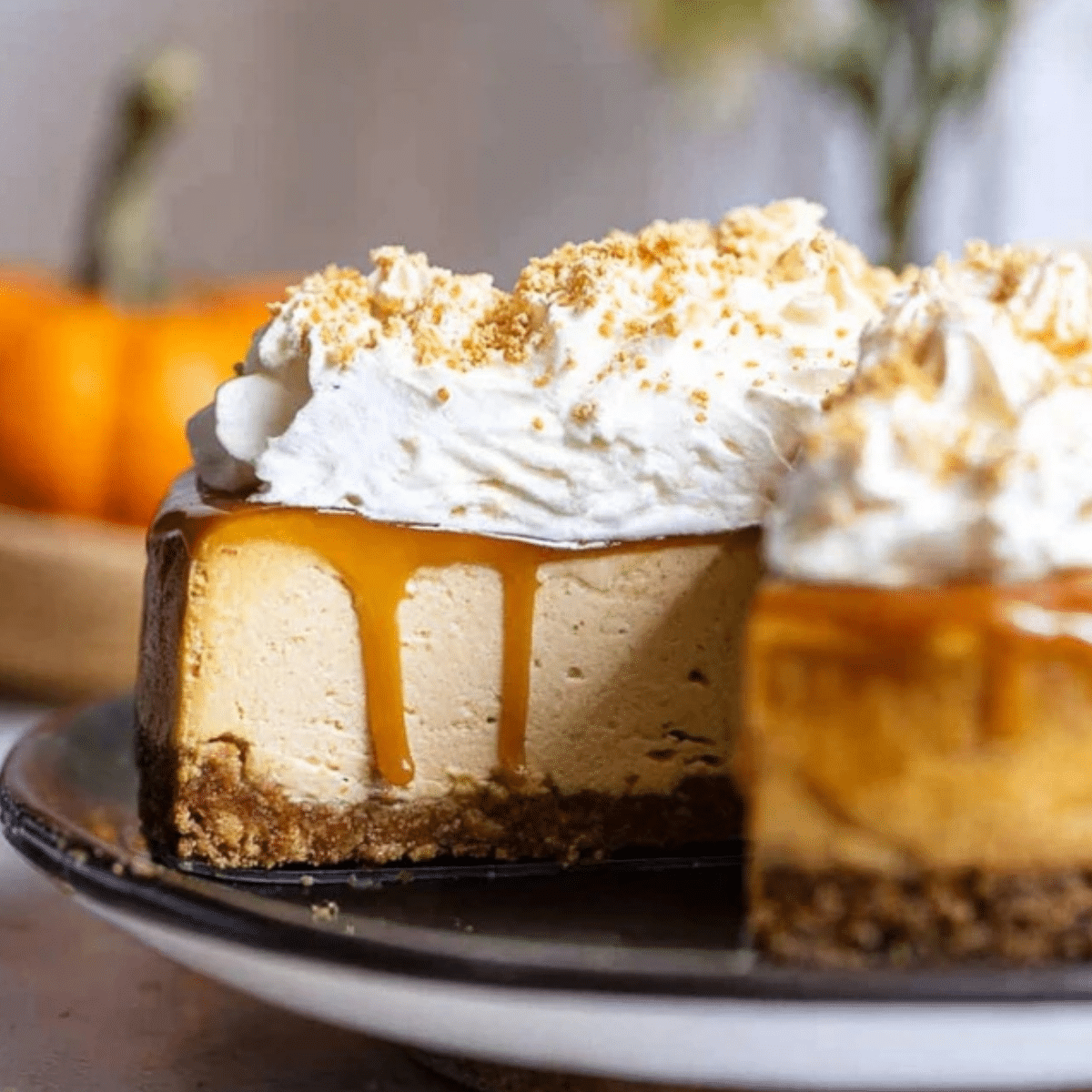 A rich and creamy fall dessert combining spiced pumpkin cheesecake with a decadent caramel topping and a graham cracker crust.
